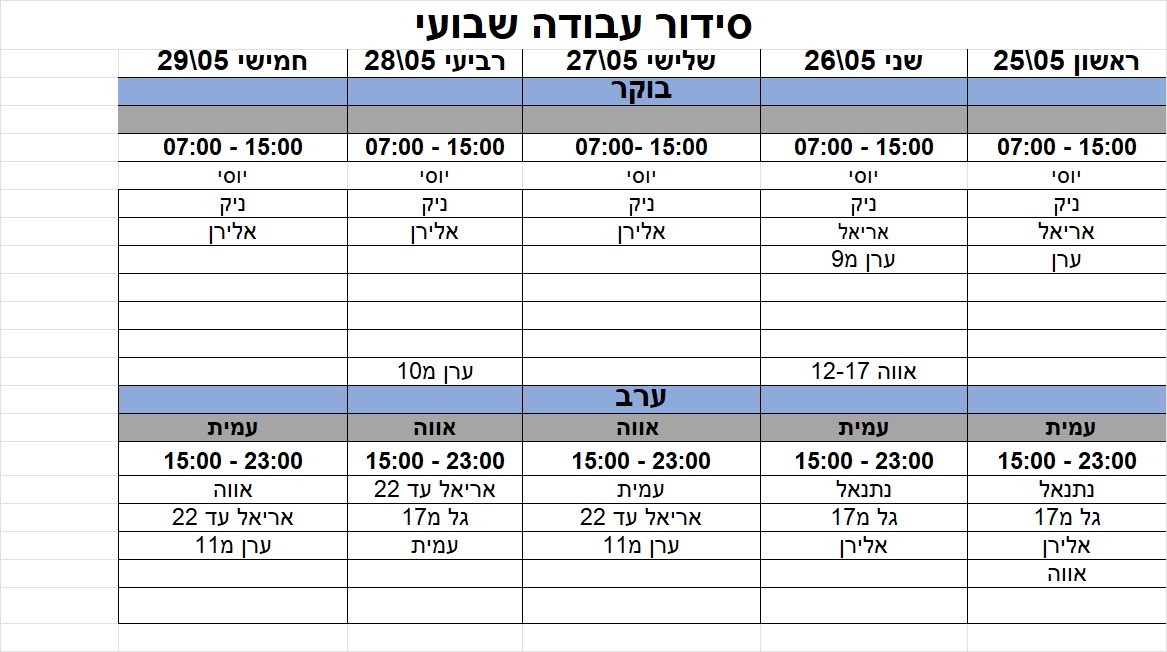 שלום לכולם,יום ראשון 01/06/25 ערב חג שבועות תתקיים רק משמרת בוקריום שני 02/06/25 חופש חג שבועות.חג שמח לכולם!